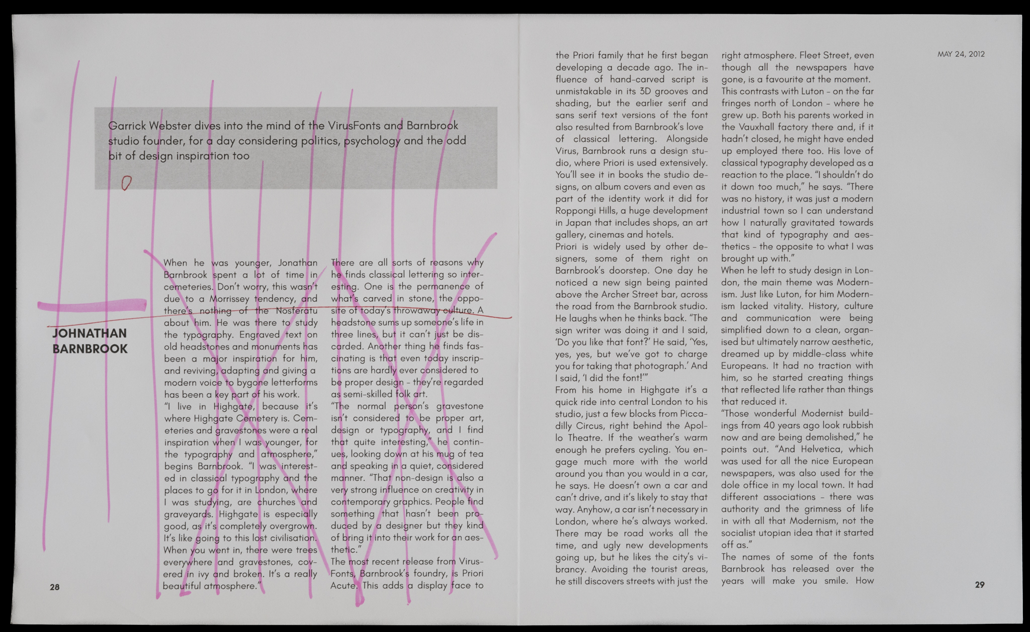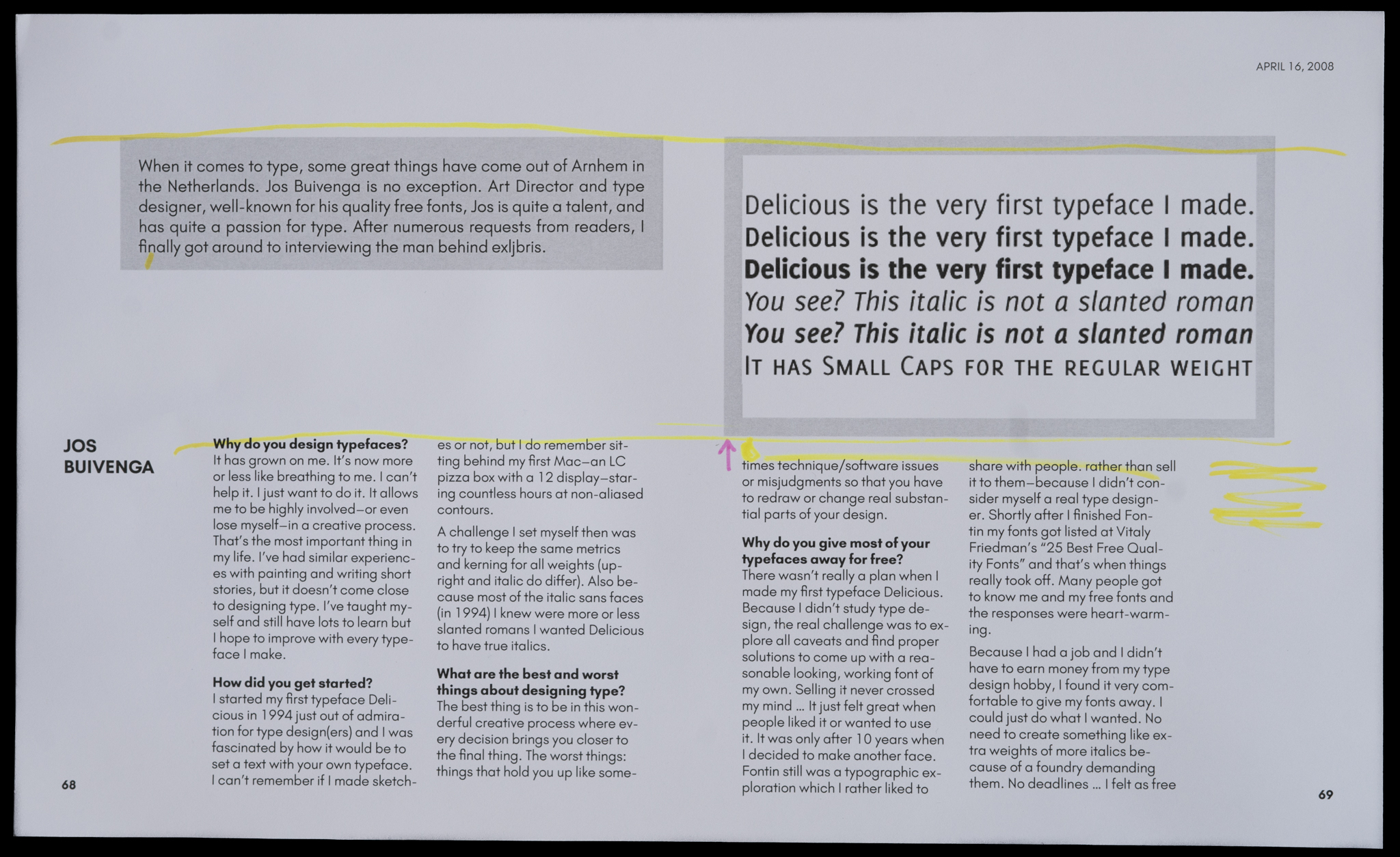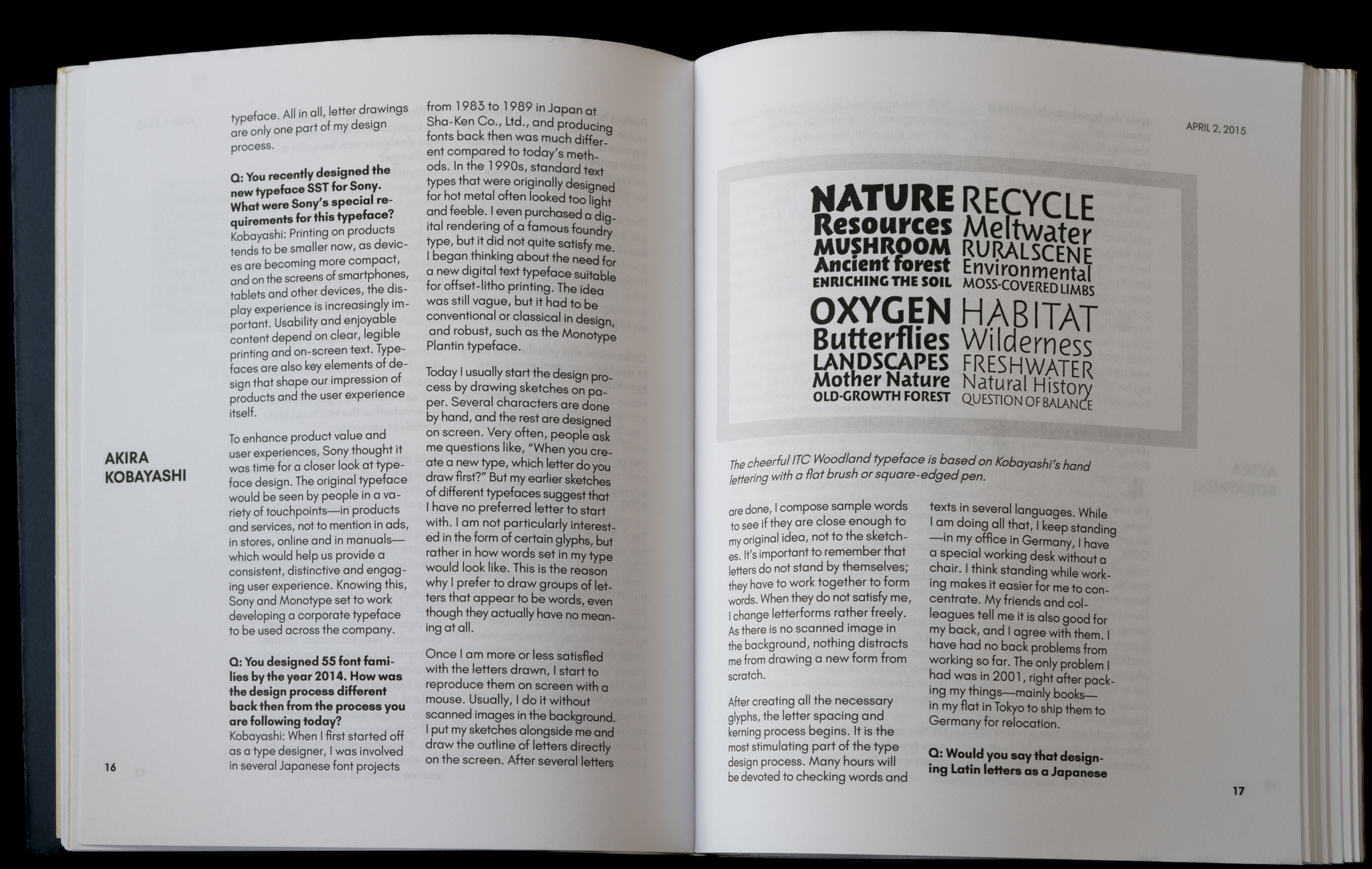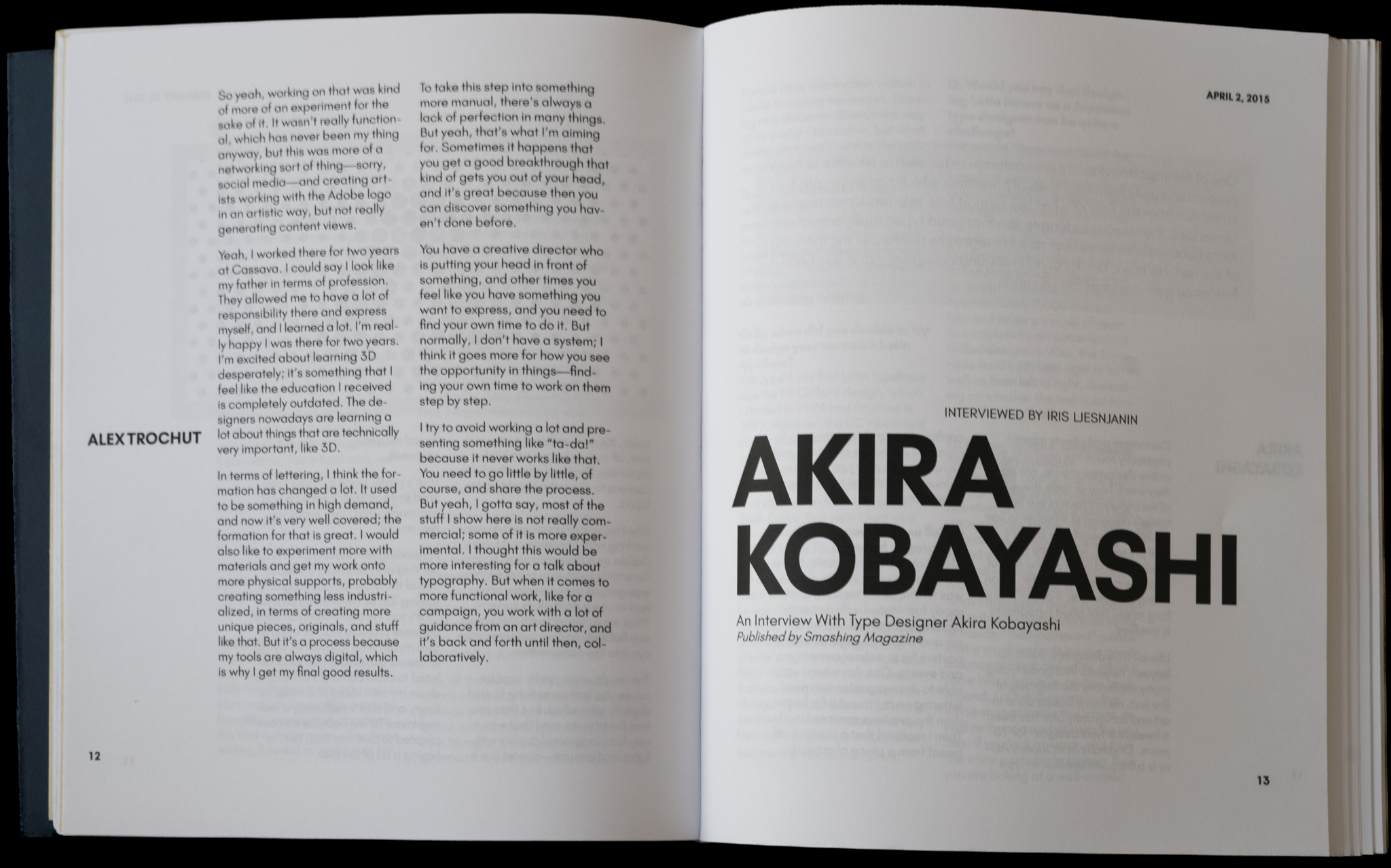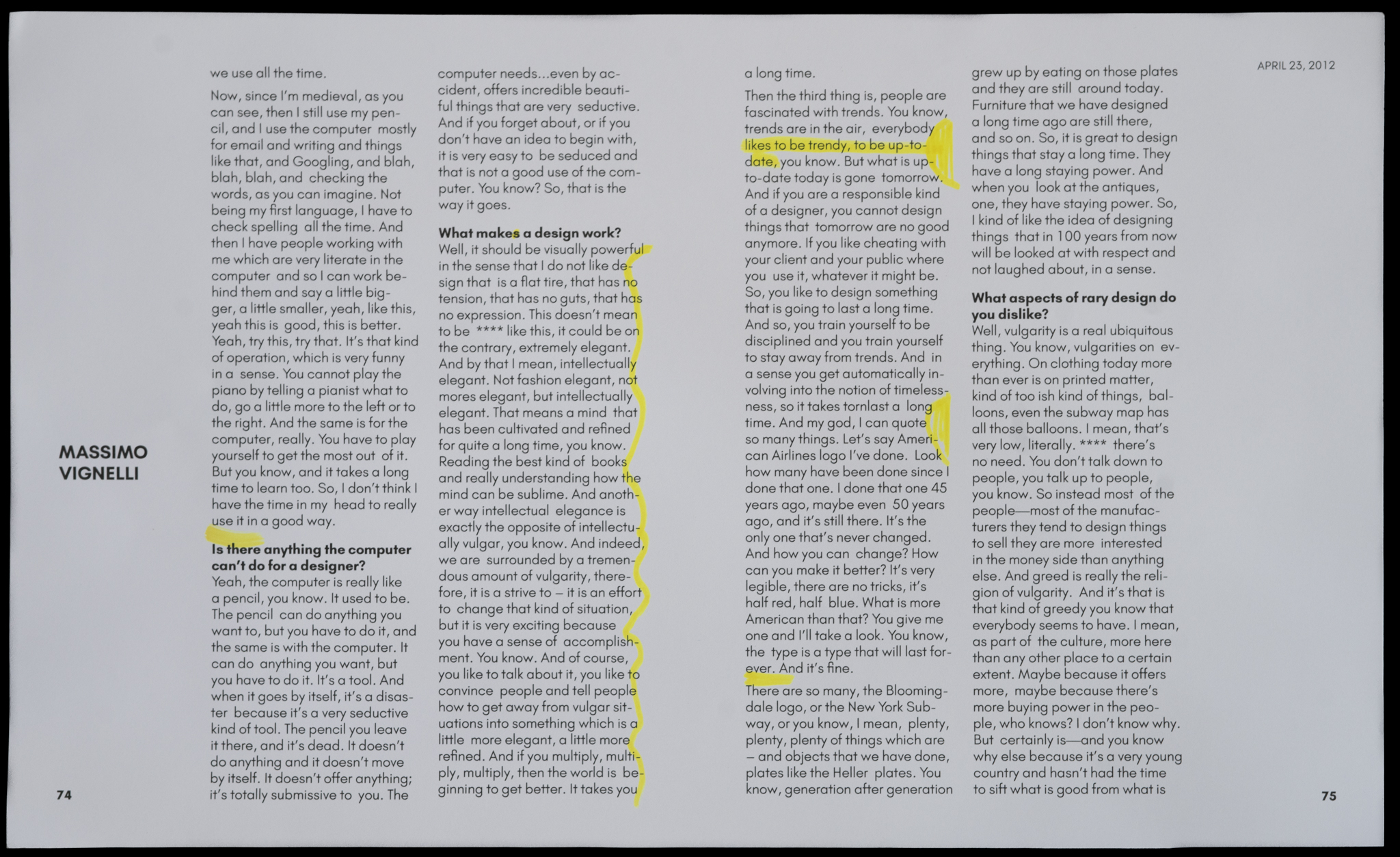 This project was a deep dive into Indesign text layout tools such as paragraph styles. I used a variety of styles to acheive an interesting page layout across several pages. Specific features to note: The big type moment on the interview title page, the designers name remaing in the left margin of the verso, pull quotes pulled into the margin, and interview introductions.