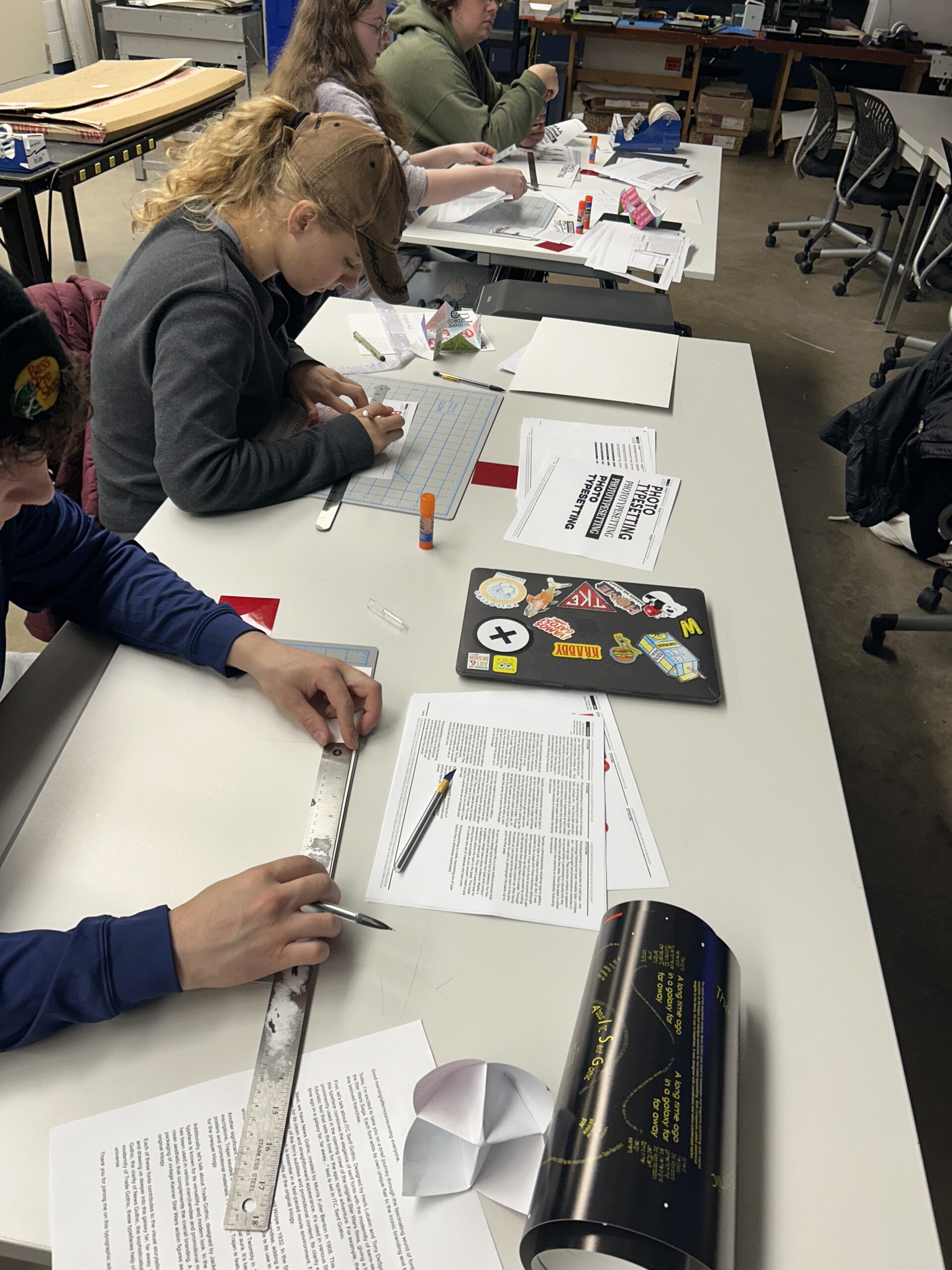 To test this, I designed a workshop. Participants were given printed typesetting sheets — simulating the output a designer would have received from a phototypesetter — along with a matte board, exacto knife, and repositionable glue. Their task was to compose a spread using only those materials.