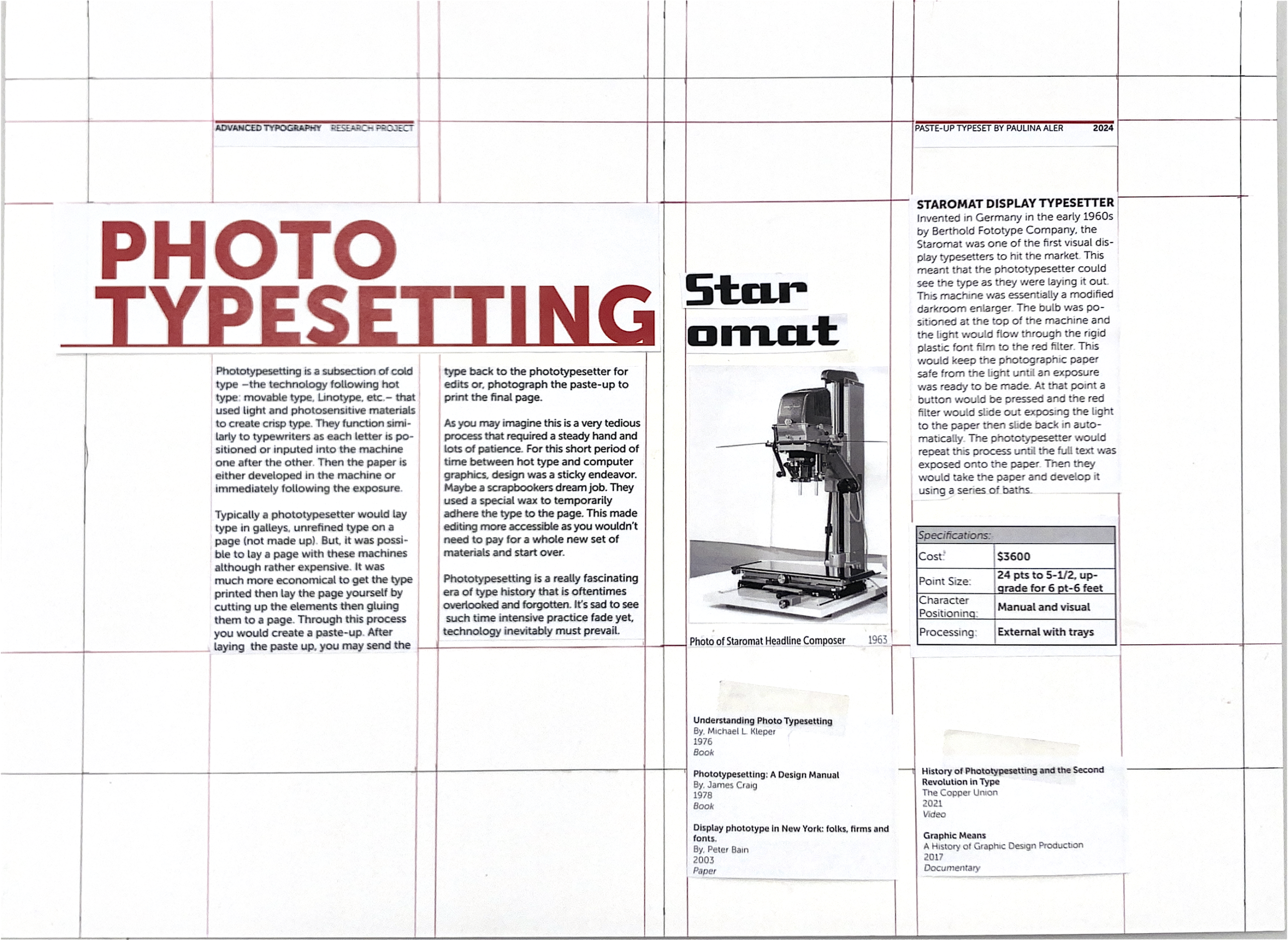 Phototypesetting sits in a strange gap in design history — after the era of movable type and Linotype, before the clean narrative of desktop publishing. Designers in this era received galleys of type from a typesetter, then physically cut and waxed those strips of paper onto a board themselves. Every spatial decision was made by hand, at actual size, with no undo.