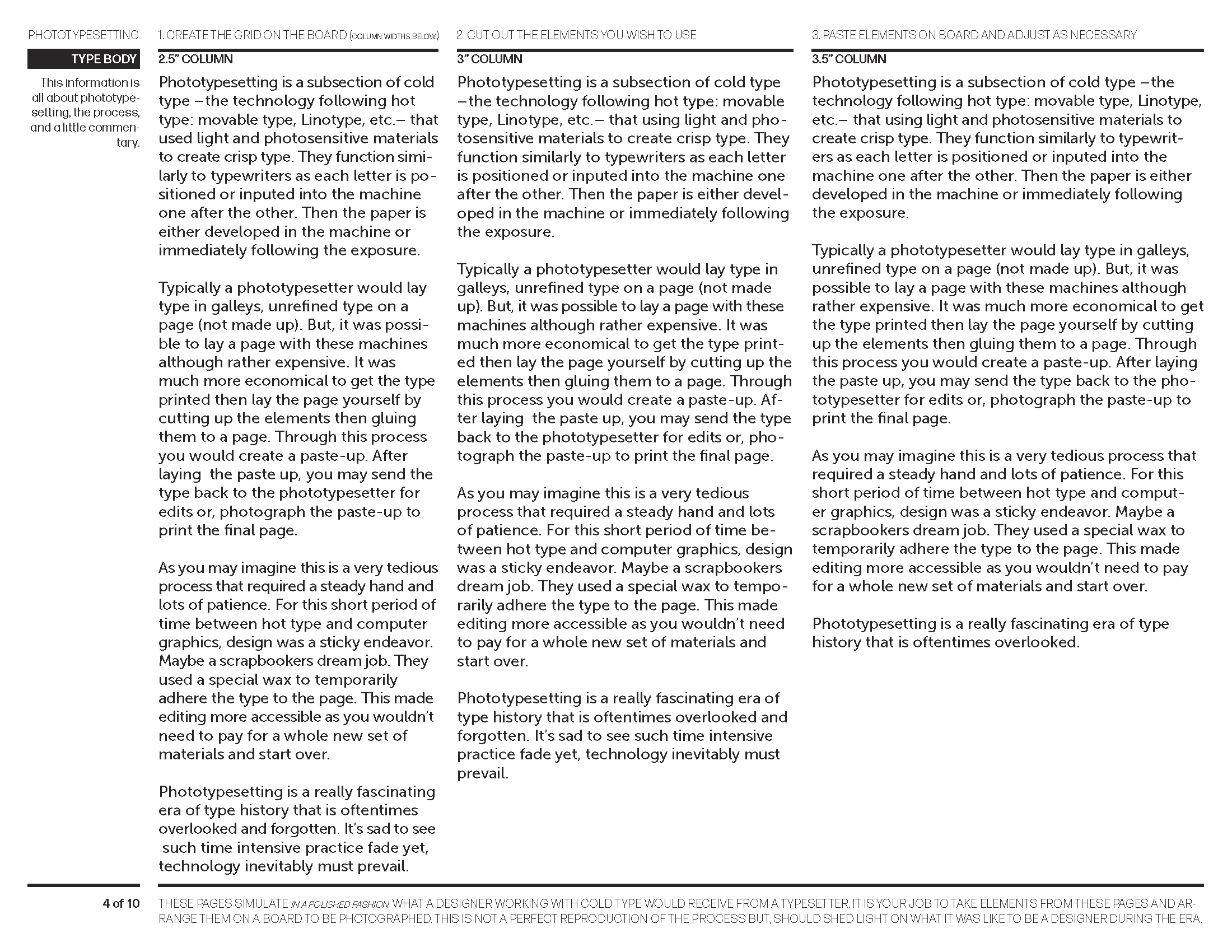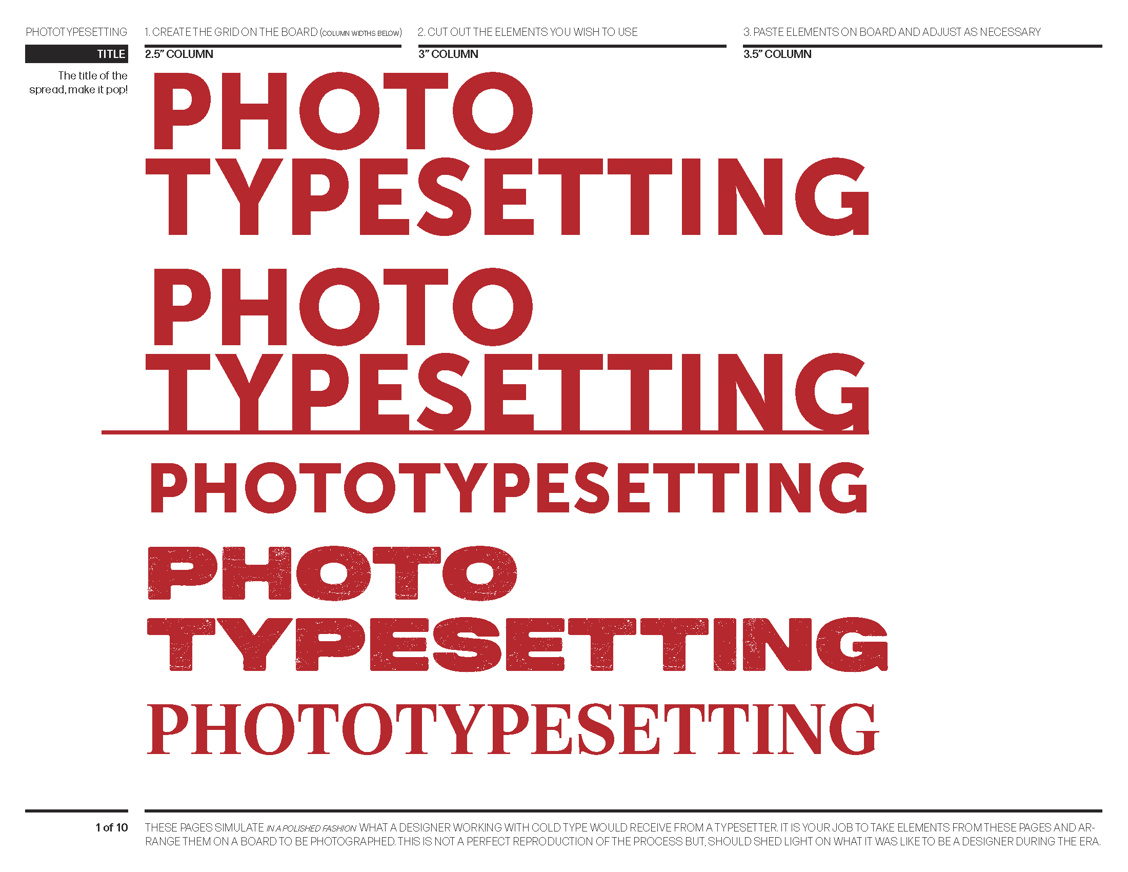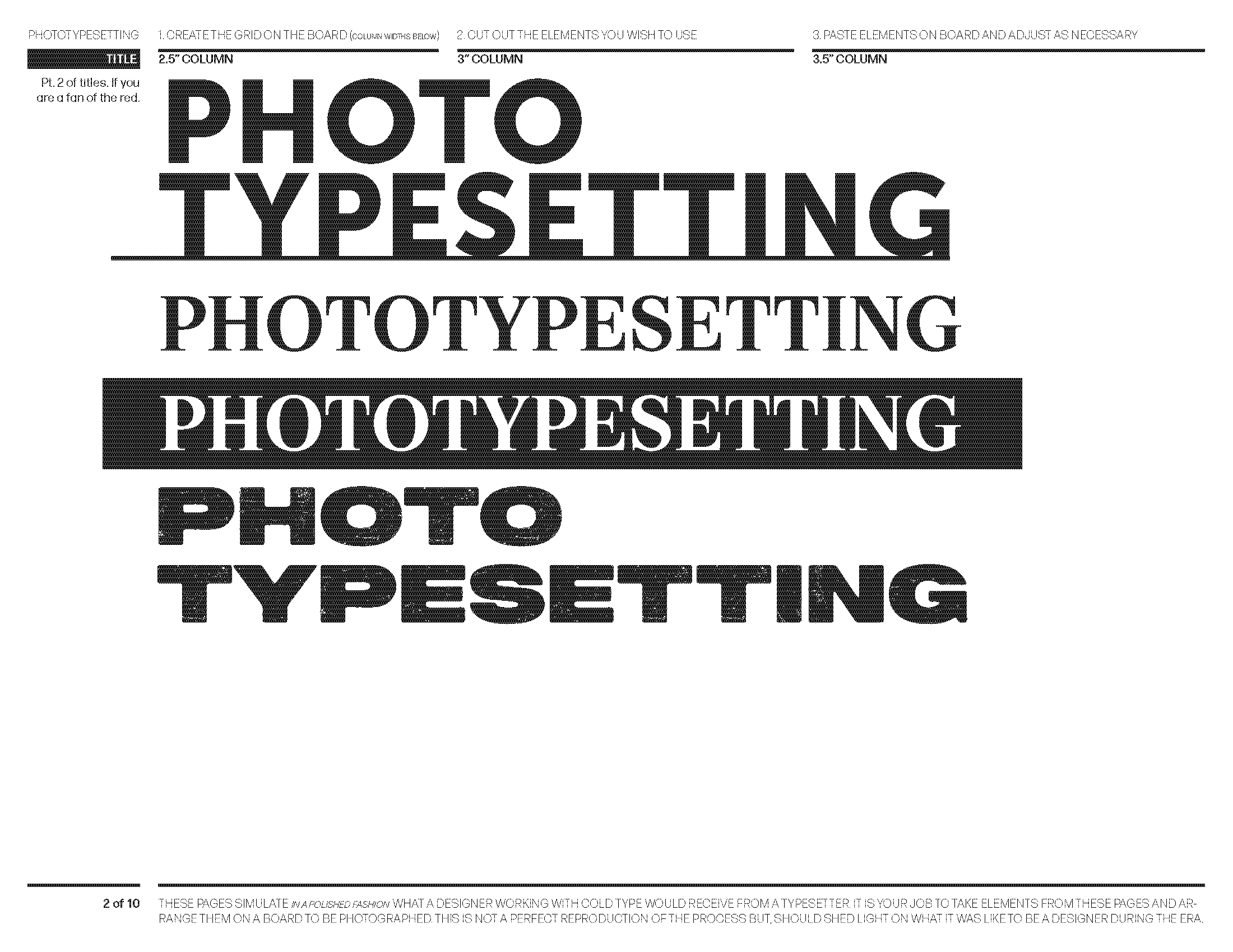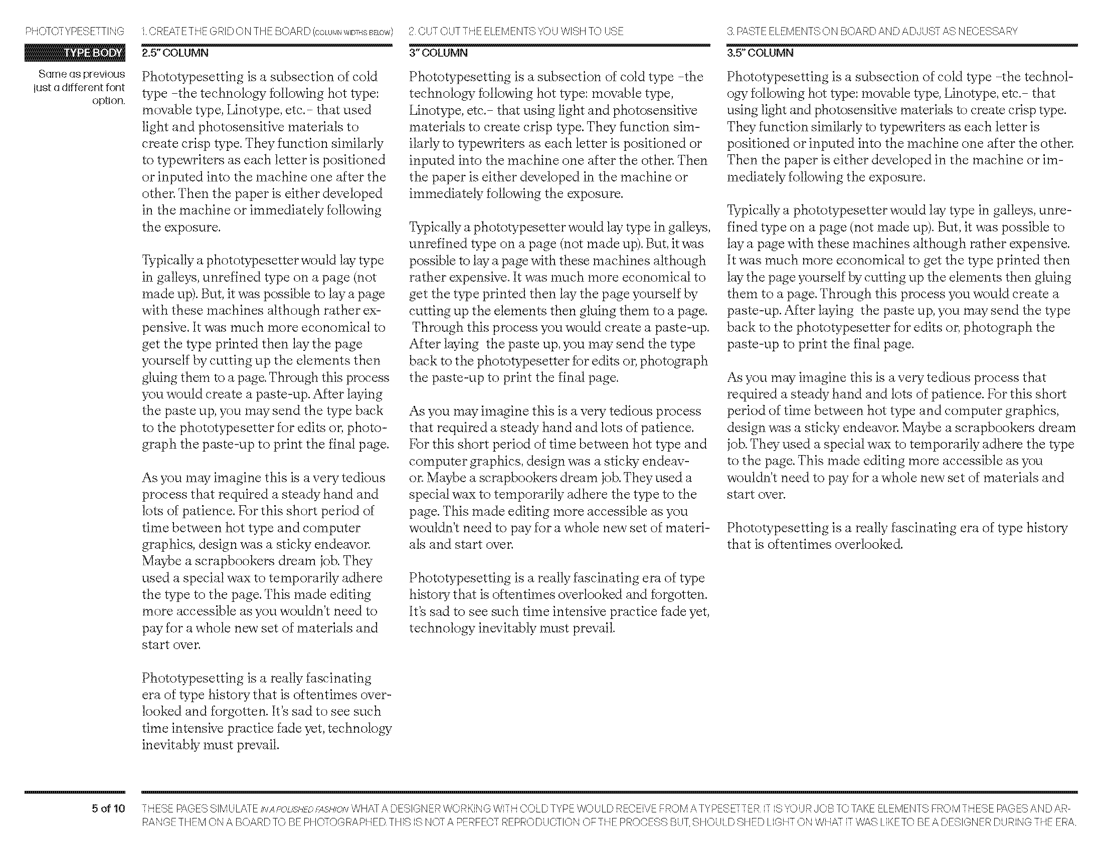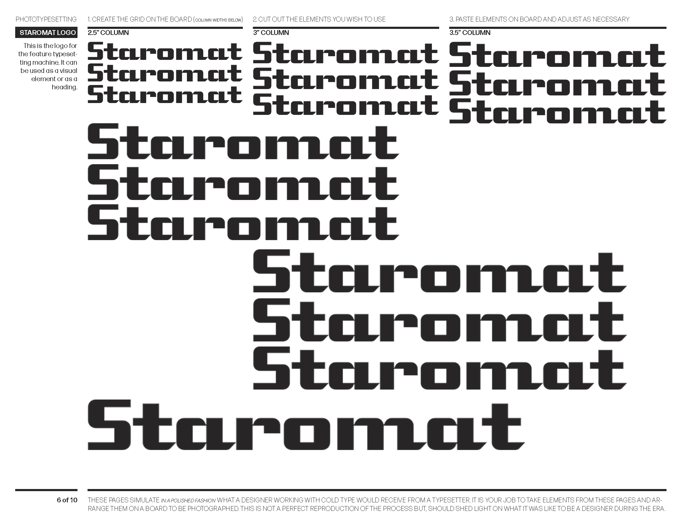 Typesetting sheets designed to simulate what a designer in the phototypesetting era would receive from a typesetter — elements to be cut, arranged, and pasted.