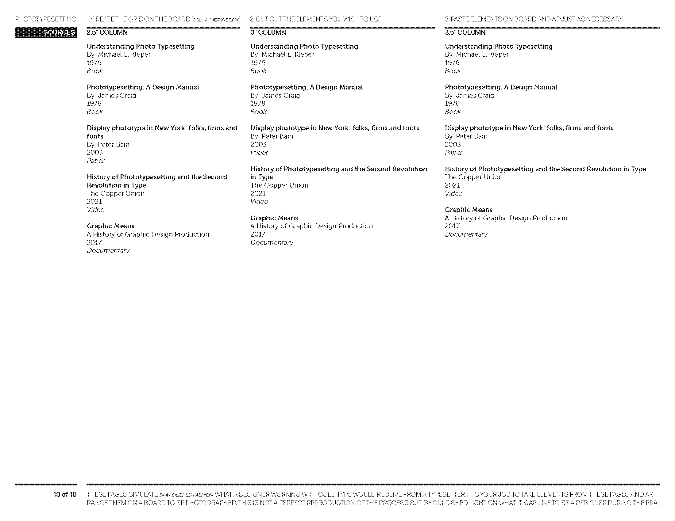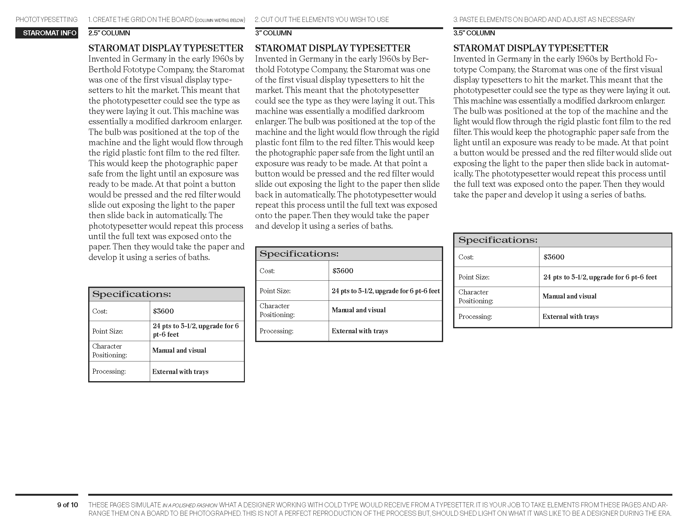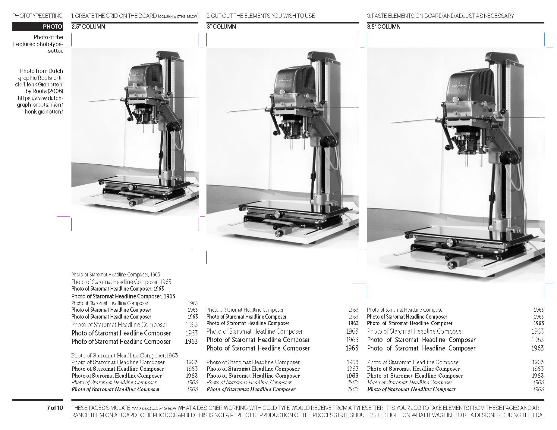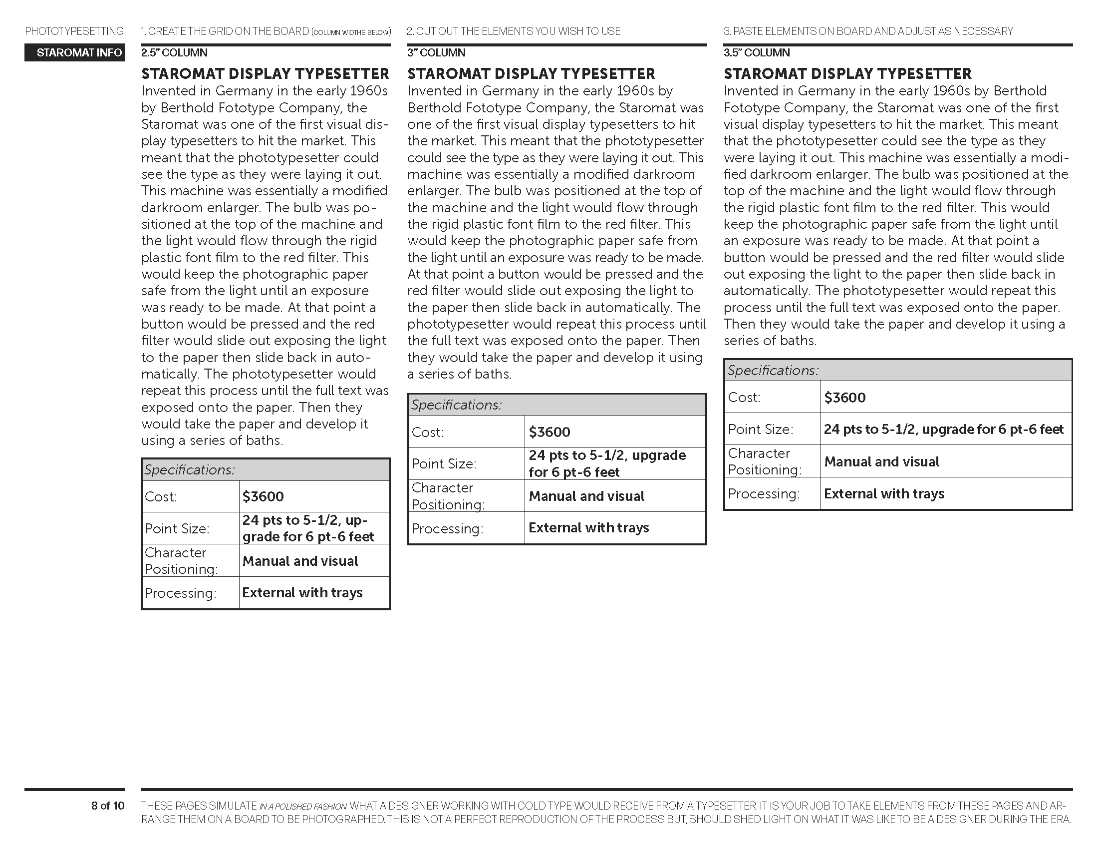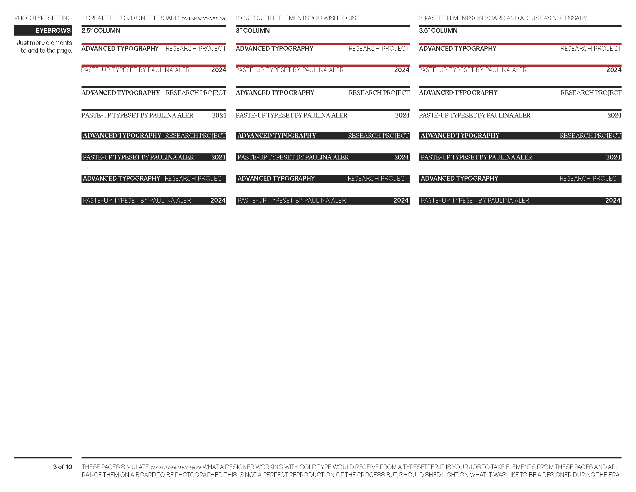 Typesetting sheets designed to simulate what a designer in the phototypesetting era would receive from a typesetter — elements to be cut, arranged, and pasted.