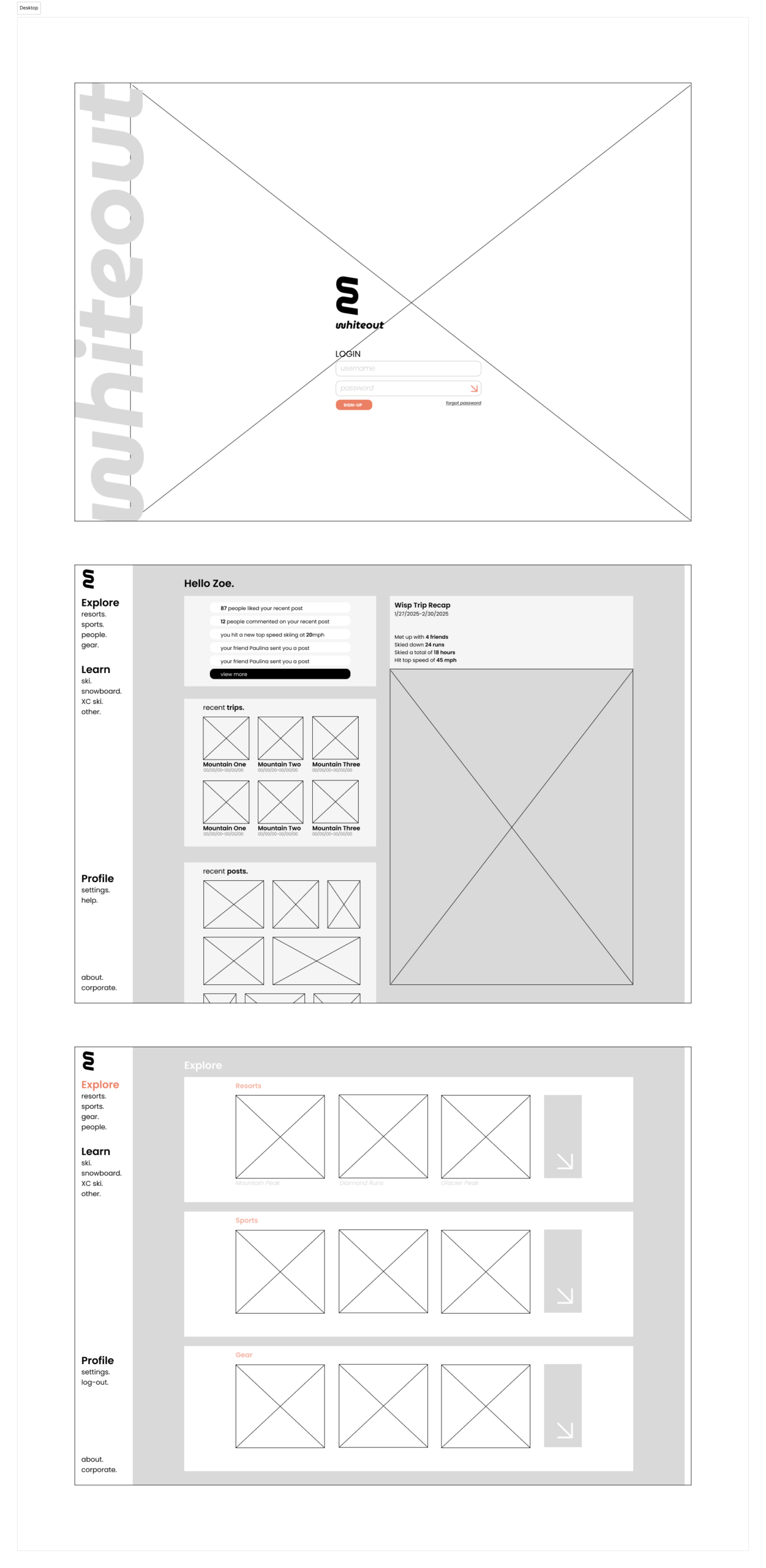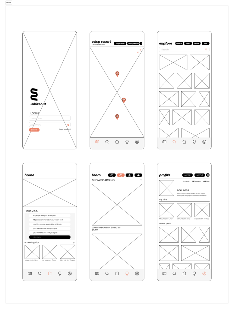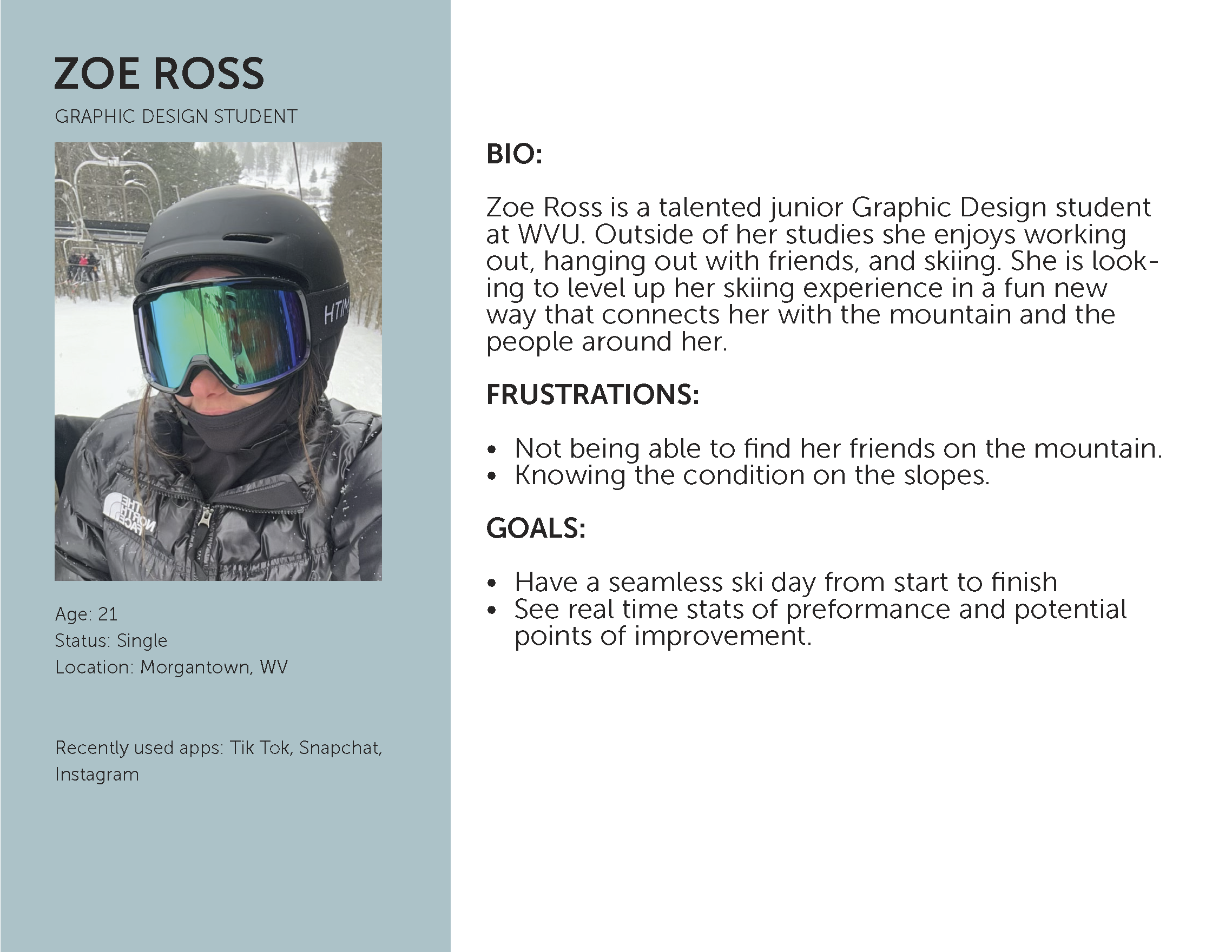 I started this project by exploring the app concept. I knew I wanted it to be social media forward but, also provide vital services like condition reports, resort information and maps, and learning tools. So, in addition to it being a social media app, it also serves as a light workout tracker and trip planner.
